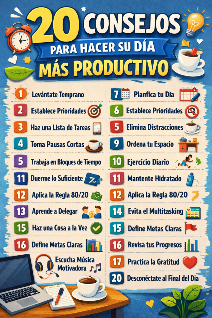 Aplicar 20 consejos para hacer su día más productivo permite organizar mejor la jornada laboral, reducir la carga mental y prevenir errores derivados del cansancio o la falta de planificación. En el ámbito del trabajo, una buena productividad está directamente relacionada con la forma en que se estructuran las tareas, se respetan los tiempos de descanso y se cuida la salud física y psicológica.